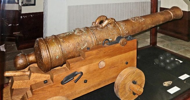 - Weaponry like muskets, powder horns, an early explosive device, and a bronze cannon with handles shaped like dolphins
